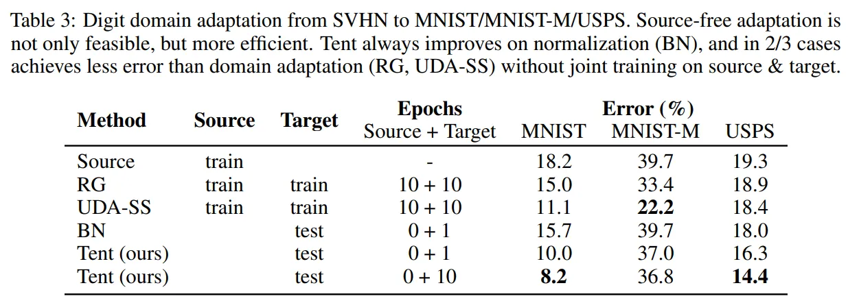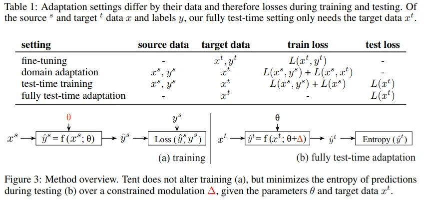 | TENT (ours) | 엔트로피 최소화 기반 γ, β 업데이트 | ❌ | ✅ |